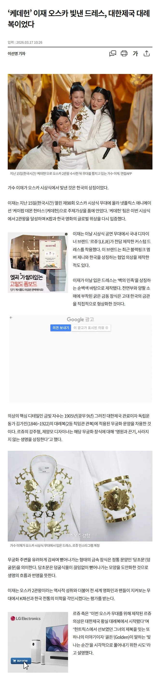 ½ºÆ÷Ã÷°æÇâ 2026³â 3¿ù 17ÀÏ ±â»çÀÔ´Ï´Ù. ‘Äɵ¥Çå’ ÀÌÀç ¿À½ºÄ« ºû³½ µå·¹½º, ´ëÇÑÁ¦±¹ ´ë·Êº¹À̾ú´Ù - ½ºÆ÷Ã÷°æÇâ